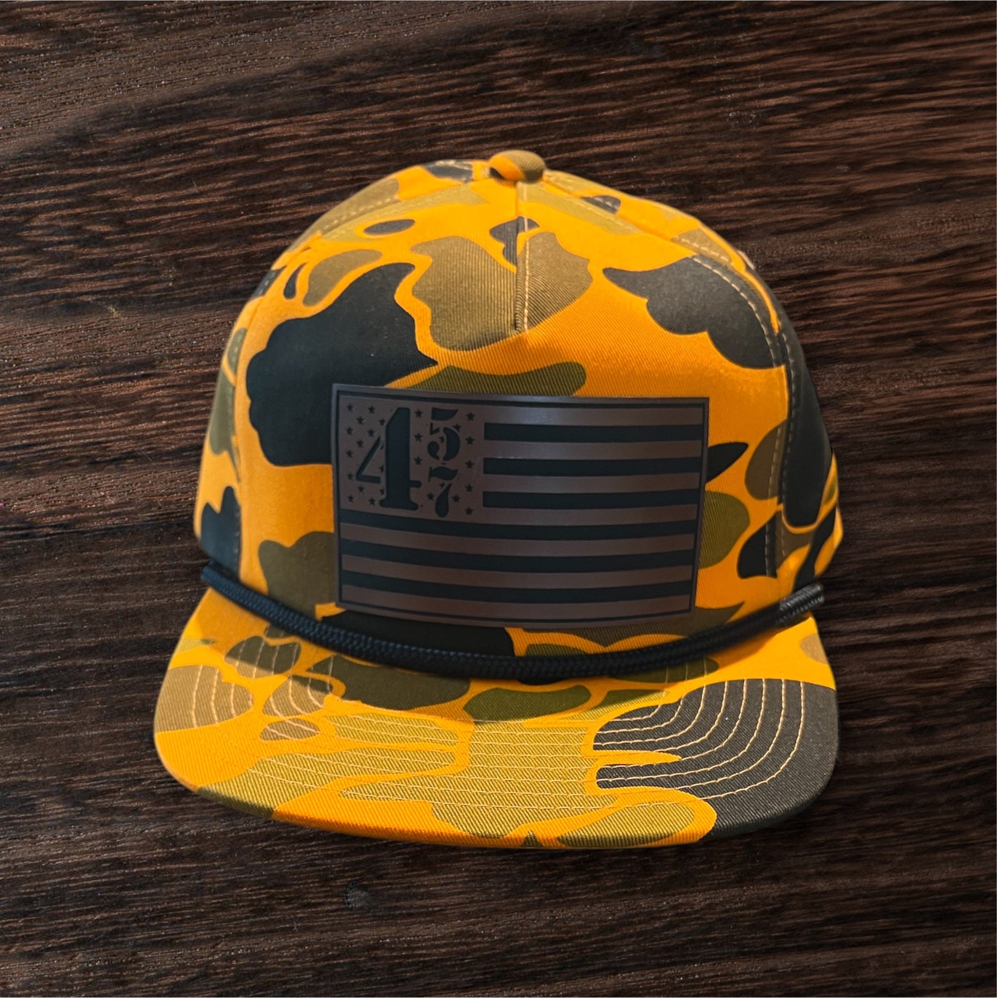 7 Panel Curved Bill Hat – Camo & Khaki with 45/47 Flag Patch